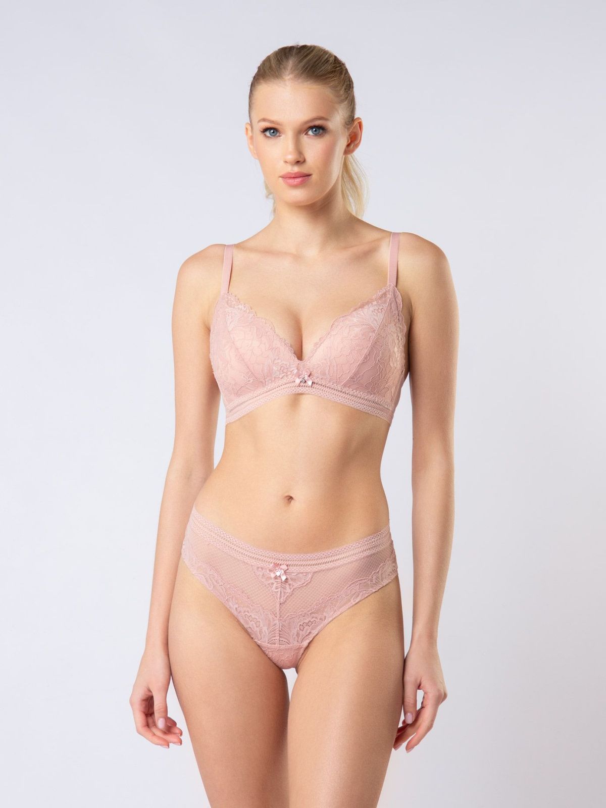 Бюстгальтер из полиамида, розового цвета, с боковыми косточками, без Push-up, с тонкой подкладкой, с кружевными вставками и обрамлением, на поясе из микросетки, на тонких регулируемых лямках.