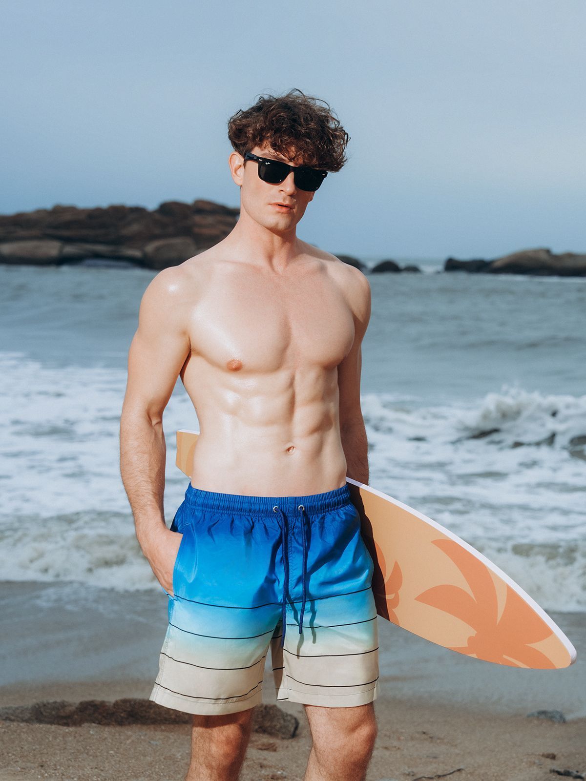 Мужские пляжные шорты: быстросохнущая ткань, свободный крой. Оснащены широким регулируемым поясом с резинкой и двумя боковыми карманами.