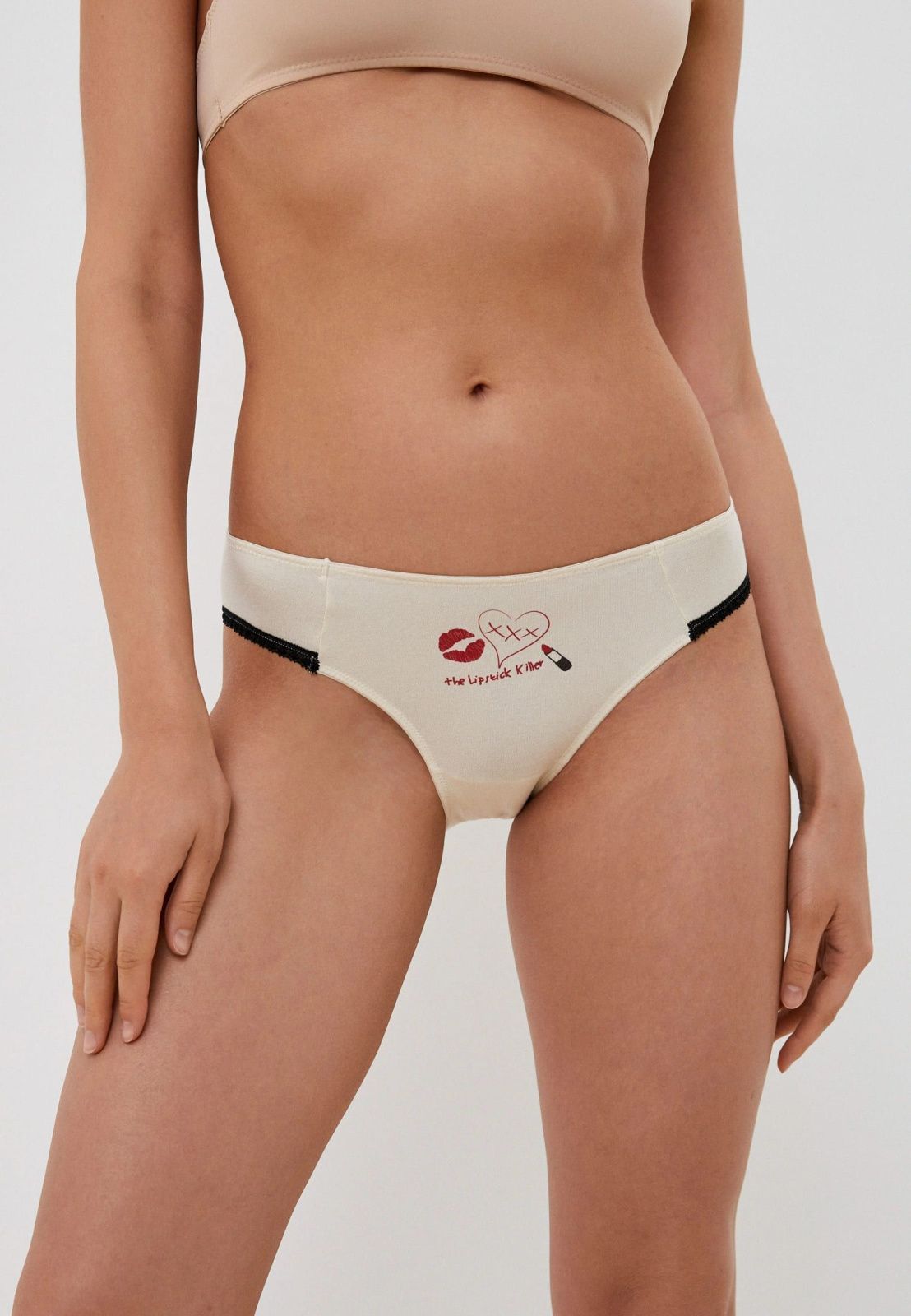 Женские трусы от торговой марки Индефини. Трусы-слипы из хлопка, бежевого цвета, с принтом и надписями, с кружевным обрамлением, на мягкой резинке.