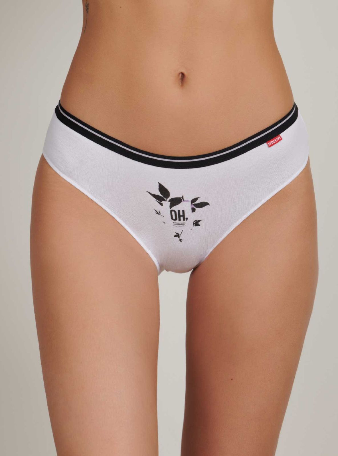 Женские трусы от торговой марки Индефини. Трусы-слипы из хлопка, белого цвета, с принтом, на мягкой резинке, средней посадки.