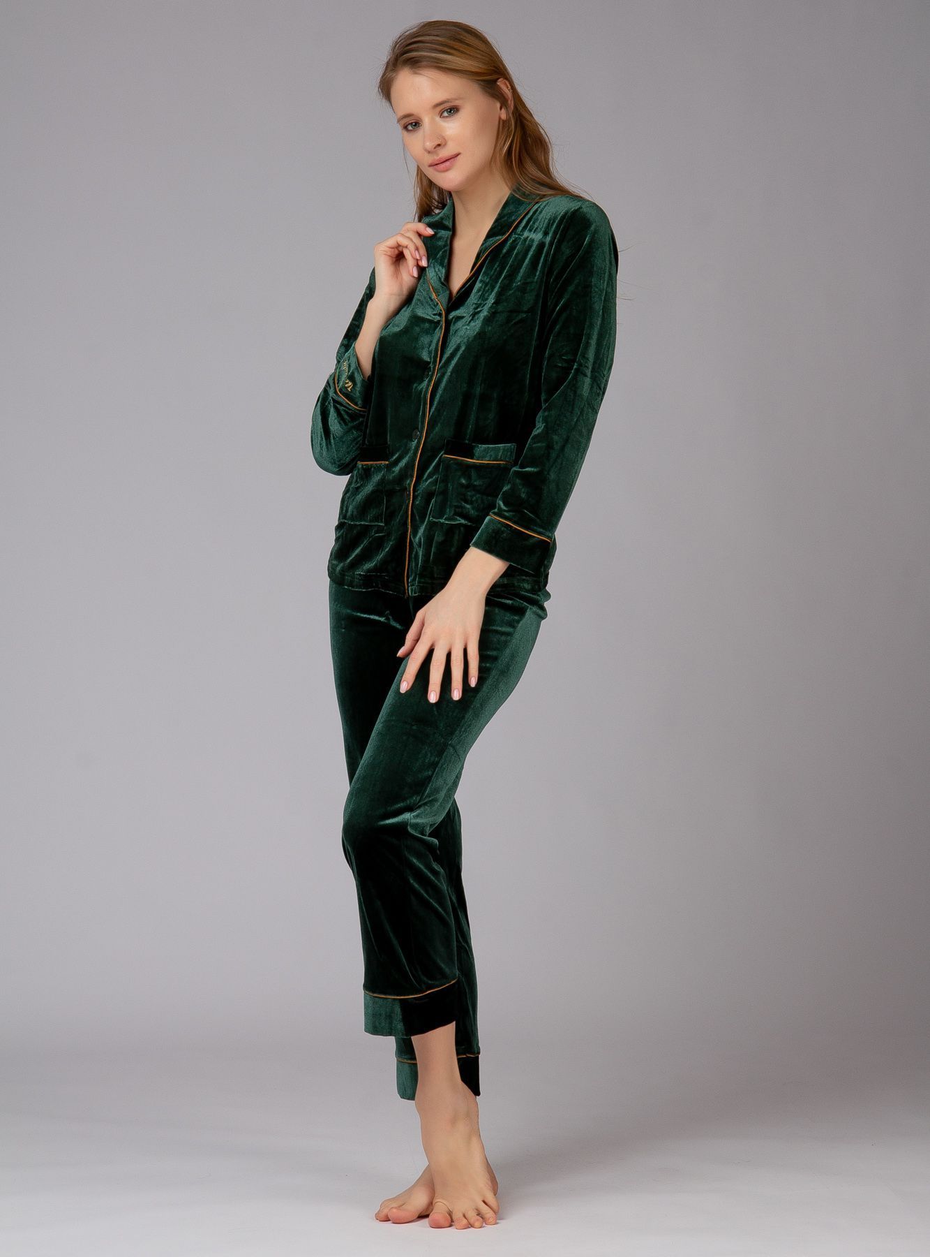 Домашний костюм от торговой марки Индефини. В комплекте рубашка с брюками. Рубашка из полиэстера, зеленого цвета, с принтом-нашивками, с длинными рукавами, с обрамлением, с воротником-отворотом, с двумя карманами по бокам, на пуговичках, прямая. Брюки из полиэстера, зеленого цвета, с обрамлением, прямые, свободного кроя, на мягкой резинке, с атласной регулирующей лентой.