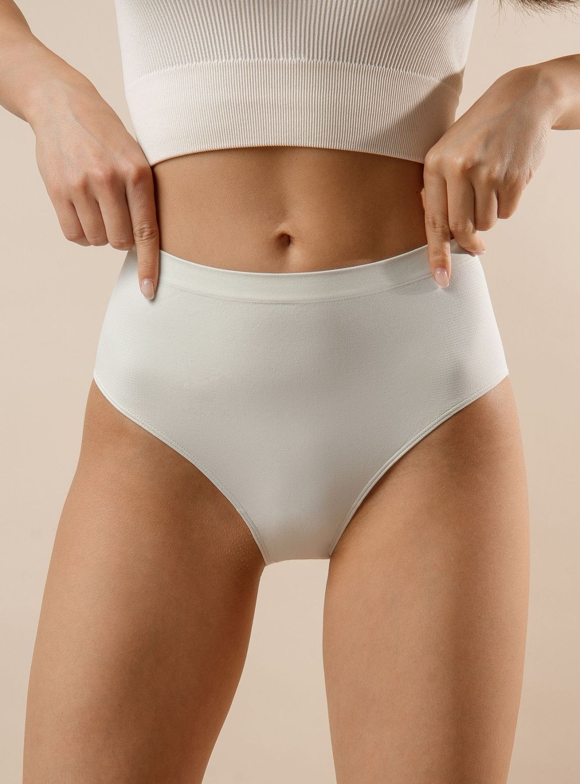 Женские трусы от торговой марки Индефини. Трусы-слипы цвета айвори с высокой посадкой, изготовлены из мягкой микрофибры в тонкий рубчик без боковых швов, дополнены гигиенической хлопковой ластовицей, вырезы для ног обработаны плоским швом вподгибку с резинкой, широкий пояс на резинке плотно фиксирует на теле.